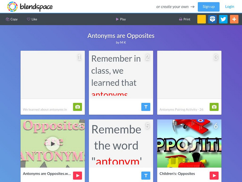 A fourteen-part learning module including links to texts, images, and videos with pre reading on antonyms.