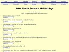In this British holidays activity, learners complete a 15 question on-line interactive exercise about festivals and holidays in Great Britain. Students read a date and tell what holiday is celebrated on that day.