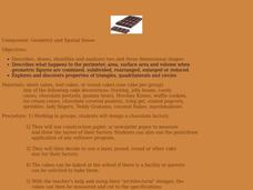 Students investigate geometric shapes in 2 and 3 dimensions. In this geometry lesson, students create a model chocolate factory working in groups and using an actual cake. Students take a quiz about measurement equations...