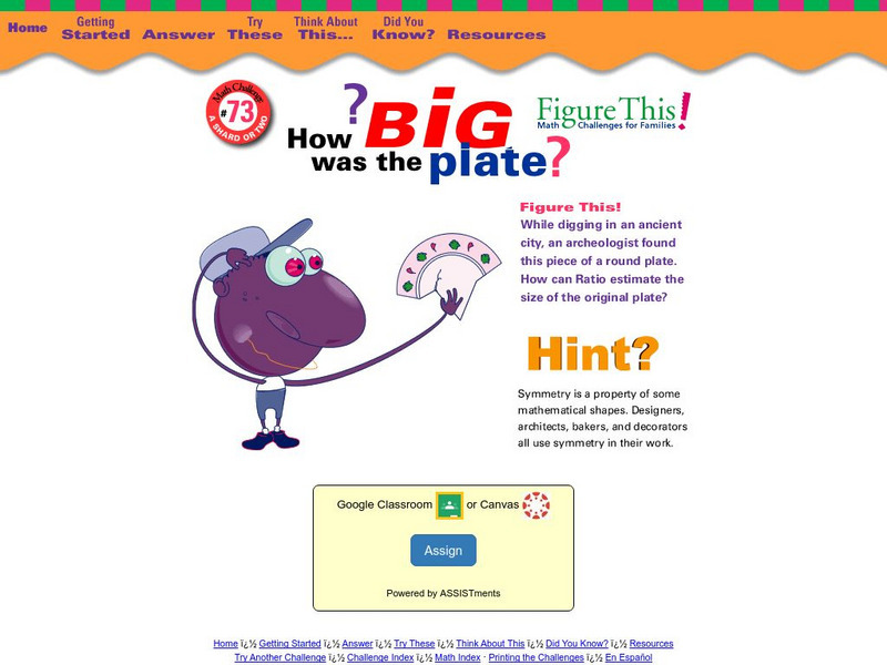 Archaeologists have just uncovered an ancient plate. They need your help to determine the original size of the plate. Try this challenge where you use concepts of symmetry and estimation to uncover the solution. An activity from the NCTM...