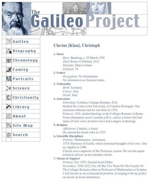 This site from the Galileo Project of the Rice University provides a biography of Christopher Clavius in list format. The information is medium in length and worth checking out for information on the subject.