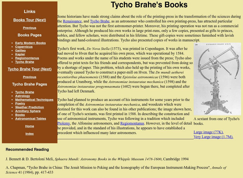 This site contains information about the books that astronomer, Tycho Brahe wrote and produced in his own printing press. Read on about Brahe and his books. Includes links to biographical information and more of Brahe's endeavors.
