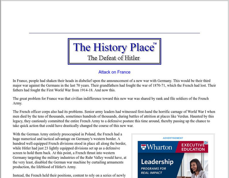 Discusses France's attitude towards the Germans at the beginning of World War II and its indecision and defensiveness, factors which made the country an easier target when Germany invaded it in 1940. It discusses Hitler's maneuvers on...