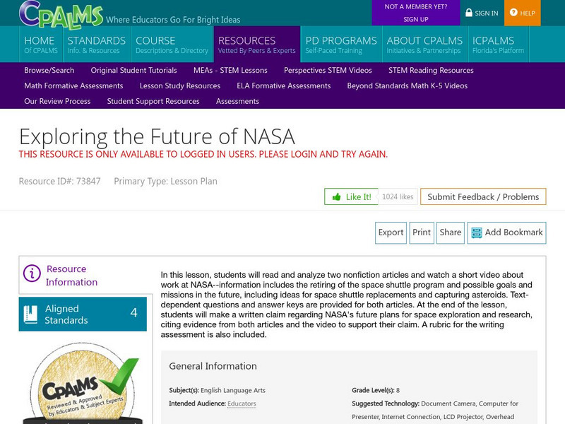 [Free Registration/Login Required] In this activity, 8th graders analyze two nonfiction articles and a short video that look at NASA, changes to the space shuttle program, and future possibilities in the United States space program. They...