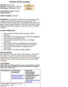 Sixth graders examine the main parts of an airplane and explain their functions. They inquire about a flight simulator. They study a flight plan and what happens when they move the flight controls. They view and keep a logbook.