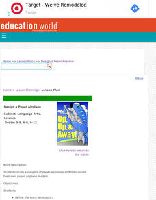 Learners explore aviation. For this physics lesson, students work cooperatively to construct kites, paper airplanes, and paper plate discs. Learners launch the object created and observe characteristics and length of flight. ...