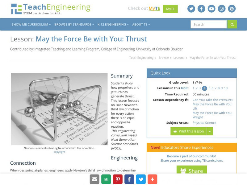 In this lesson, students will study how propellers and jet turbines generate thrust. This lesson focuses on Isaac Newton's 3rd Law of Motion, which states that for every action there is an equal and opposite reaction.