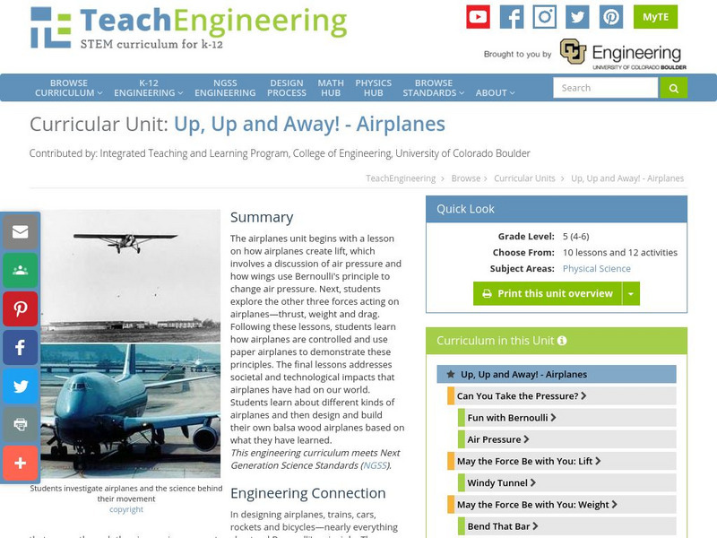 The airplanes unit begins with a lesson on how airplanes create lift, which involves a discussion of air pressure and how wings use Bernoulli's Principle to change air pressure. Following the lessons on lift, students explore the other...