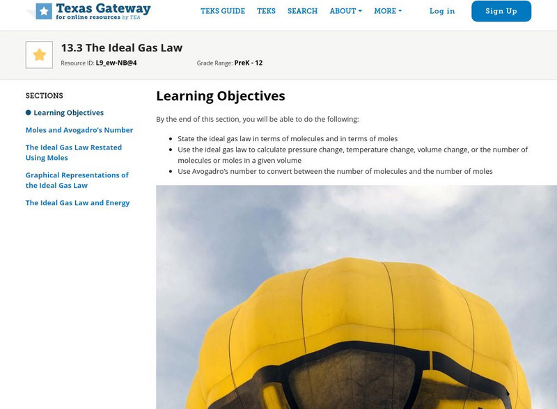 [Free Registration/Login may be required to access all resource tools.] Students read about and explore video clips, diagrams, and example problems using the Ideal Gas Law.
