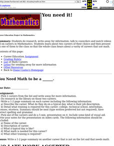 Students research, write away for information, talk to councilors and watch videos all on careers in Mathematics. Students learn about two careers of their choice and present information on one of them to the class.