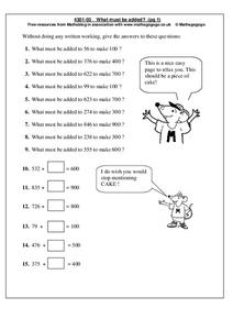 In this addition worksheet, students write in the number that makes the addition operation correct. For example, they are asked what must be added to 555 to make 600. There are 15 questions on this page and the answers are on the second...