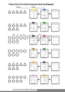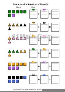 For this basic addition worksheet, students solve 6 problems that require them to add using 1-digit numbers and shape math counters.