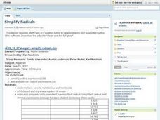 Simplifying is radical, dude! After reviewing how to simplify square roots of whole numbers, scholars consider how to simplify square roots of algebraic monomials. Also taken under consideration is how to simplify cube roots of whole...