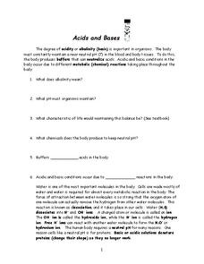 In this acids and bases worksheet, students complete 32 fill in the blank and short answer questions on acidity or alkalinity. They color molecular diagram according to the key.