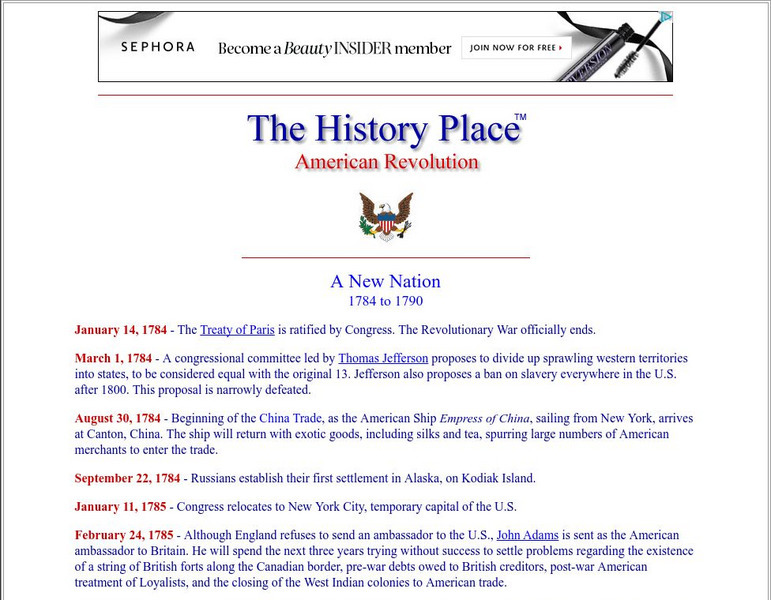 This site from The History Place provides a timeline of American history between 1784 and 1790. Mentions many famous people and events of the era. Links to John Adams, Thomas Jefferson, Samuel Adams, James Madison, the Constitution, Bill...