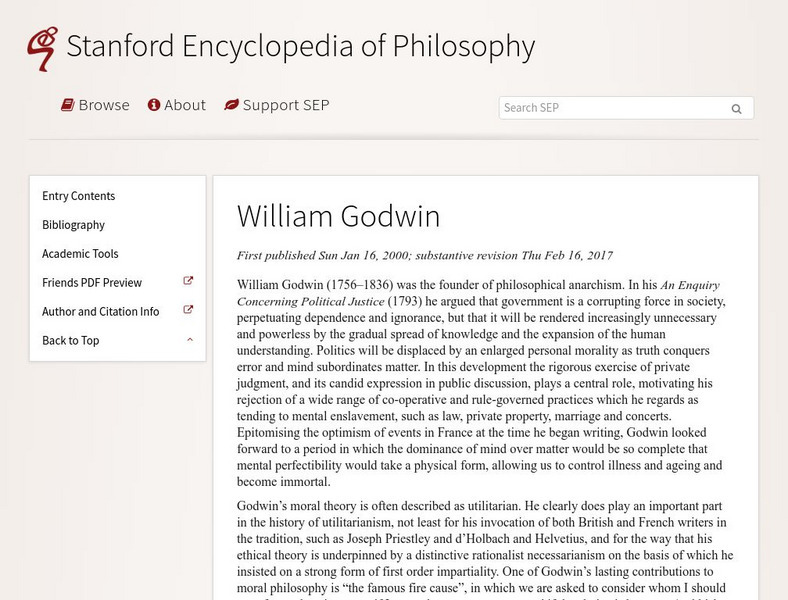 This is a substantial exploration of Godwin's life and ideas. Includes a section of other internet resources and a bibliography.
