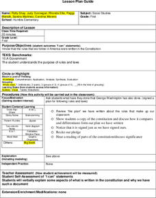 Students determine that the rules that we follow in America were written in the Constitution. They study a copy of the constitution and discuss how it compares and differentiates from the plan the class has written. They recite our...