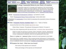 In this ecology community status worksheet, students research their state's ecosystem, make a chart of the biodiversity, analyze the chart and identify issues with wetland species. This page has several links to helpful web resources.
