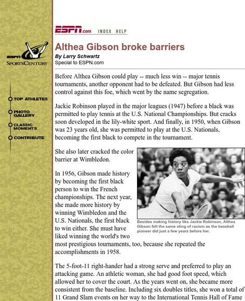 In this encyclopedia entry you'll read about Althea Gibson, the inspiring black tennis player, her tournament wins, and her many awards.