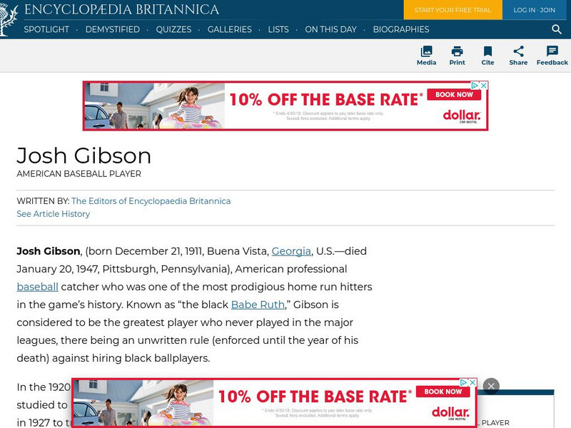 This entry from Encyclopedia Britannica features Josh Gibson, an American professional baseball catcher who was one of the most prodigious home run hitters in the game's history. Known as "the black Babe Ruth," Gibson is considered to be...