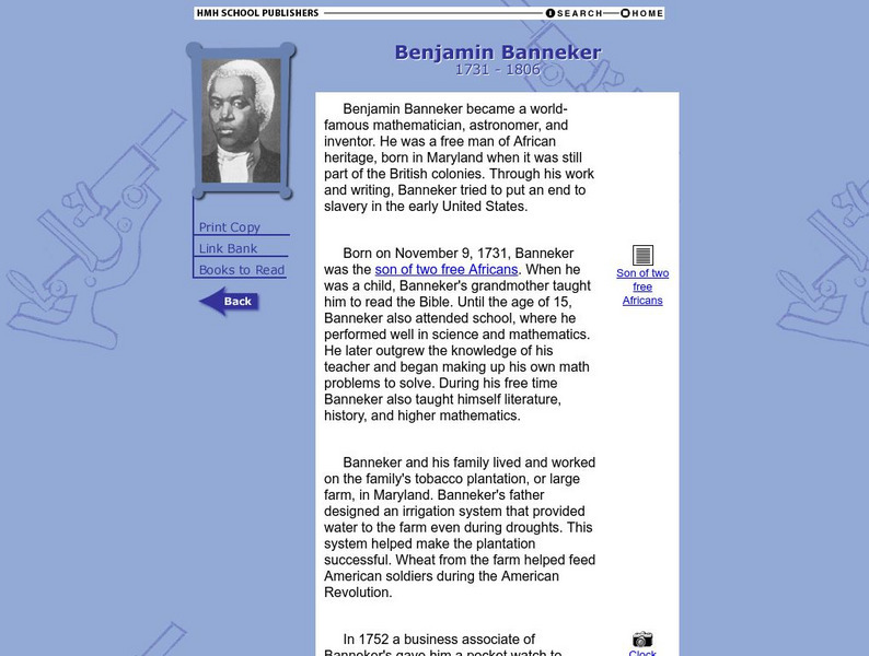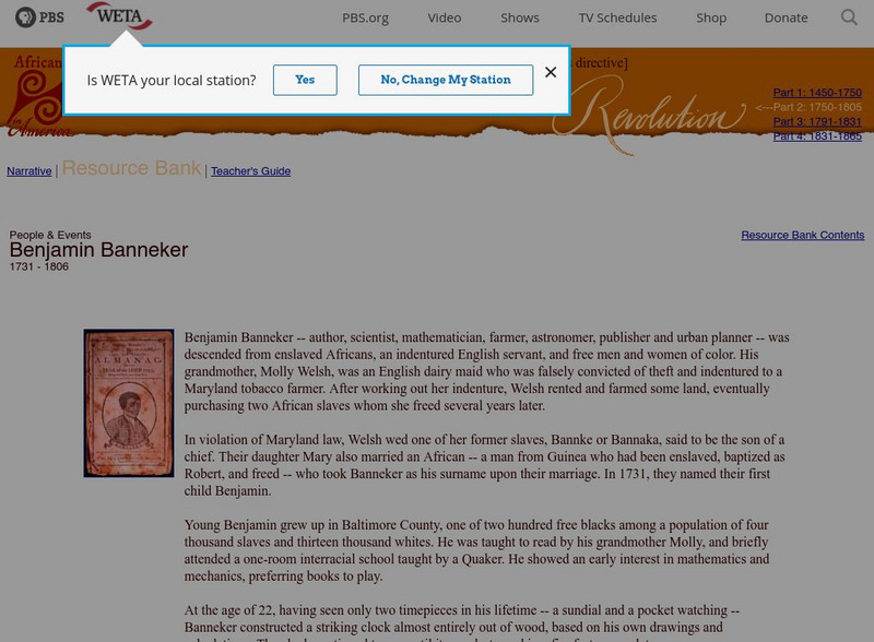 This website describes the life of Benjamin Banneker, a free and educated black man from Baltimore, Maryland. It describes his many accomplishments.