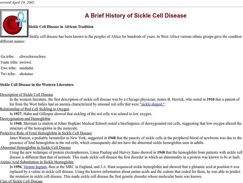 This site is put out by a professor of the Harvard Medical School. It contains factual information on Sickle Cell Disease and the information is set up by links under different subject headings. This is a great site to check out on the...