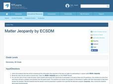 Fourth graders explore science by participating in a Jeopardy style game. In this matter lesson, 4th graders define matter and identify the characteristics and properties of it. Students collaborate in two teams and utilize a SMART board...