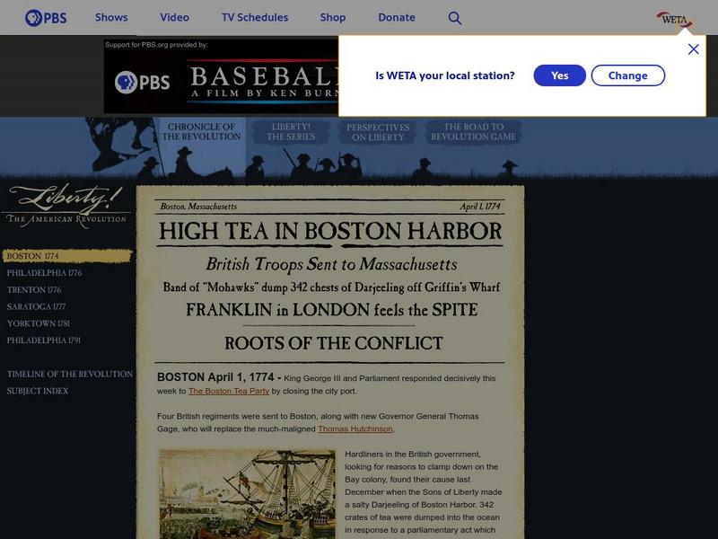 Presented in a newspaper format, this site explores the rise of independence in the colonies with a focus on the Boston Tea Party as it occurred on April 1, 1774 and Benjamin Franklin's experience in London. Content includes a look at...