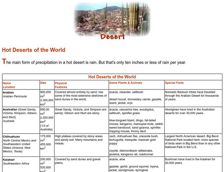 Find out about the sizes, physical features, and plant and animal life of some of the world's great deserts, including the Arabian, the Great Sandy, the Chihuahuan, the Kalahari, the Mojave, the Sahara, the Sonoran, and the Thar deserts.