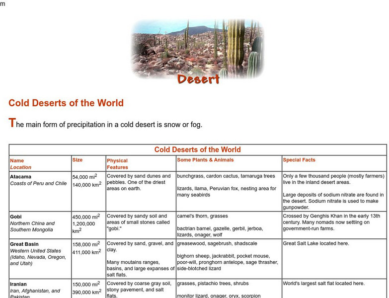 A chart summarizes the sizes, physical features, plant and animal life, and special facts of a selection of the world's cold deserts, including Antarctica, the Gobi, and the Great Basin Desert in the western United States.