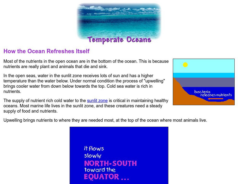 Watch the animated illustrations to see how the nutrients at the bottom of the ocean get circulated to the top. This upwelling is necessary in order to maintain a healthy ocean.