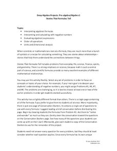 Learn the stories a formula holds. An interesting lesson takes a unique approach to teach how to use formulas. Beginning with a formula, learners predict what the variables stand for and then use the formula to make calculations and tell...