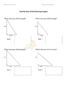 In this area worksheet, students calculate the area of 4 triangles, writing answers in rectangles beneath each triangle. A reference web site is given for additional activities.