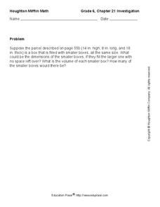 In this math word problems worksheet, 6th graders use their problem solving skills to respond to 1 problem that requires them to calculate volume.