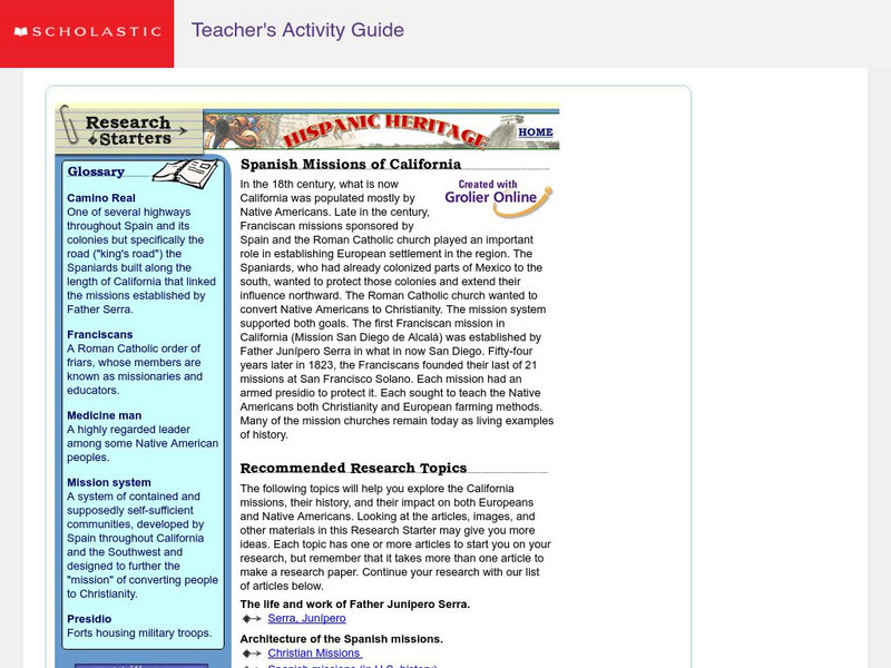 Students can use this page as a jumping off page to do research on Spanish missions in California. There are numerous links to Scholastic articles and to other websites on subtopics such as missionaries, Franciscans and places in...