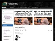 Fifth graders investigate conflict resolution through the study of justice.  In this justice lesson, 5th graders are put in scenarios of unfair conditions.  Students discuss the unfair situations and their feelings about them....