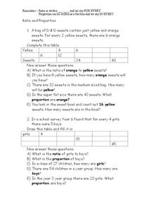 In this math learning exercise, students study ratio and proportion by solving 12 word problems. The examples pertain to the color of candies in a bowl and also the ration of boys to girls in a classroom.