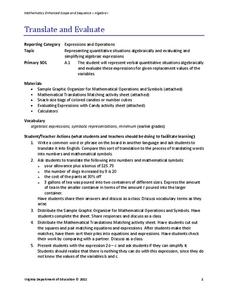 Translate, evaluate, educate. Discover how to translate and evaluate expressions. Young mathematicians first review words and phrases that indicate operations and learn to write algebraic expressions from verbal descriptions....