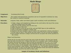 Students practice using mathematical vocabulary by playing a class game. In this math comprehension lesson plan, students investigate a group of math vocab words and their definitions, then create a bingo card using the Internet....