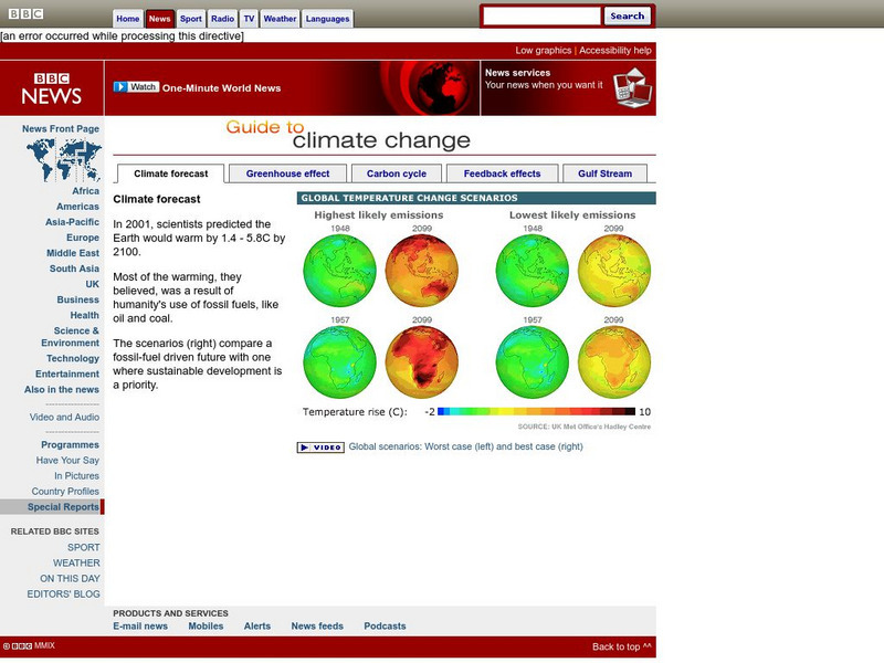 The BBC offers an interactive guide to climate change, including a sliding scale depicting climate change from 1885 to 2099, animation which explores how the greenhouse effect works, and detailed diagrams exploring the carbon cycle, the...
