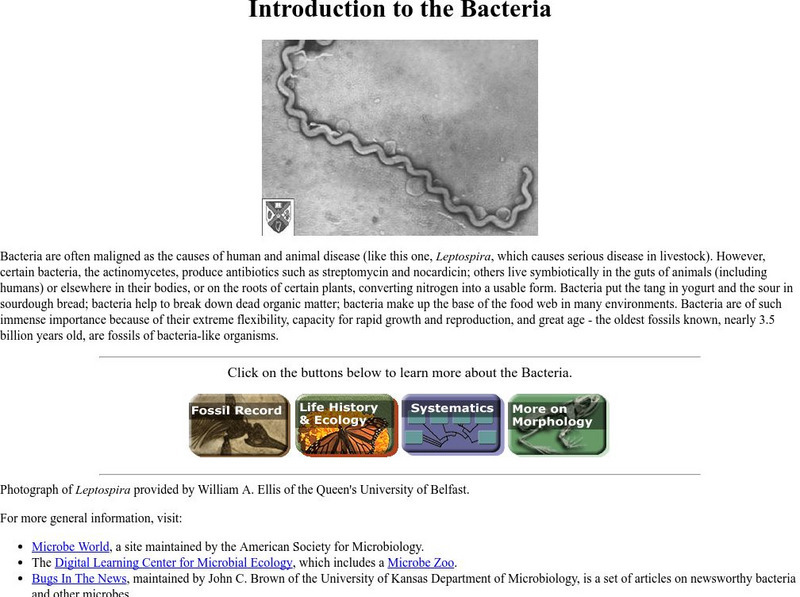 This site provides an introduction to bacteria and examines fossil records, life history and ecology, systematics, and morphology.