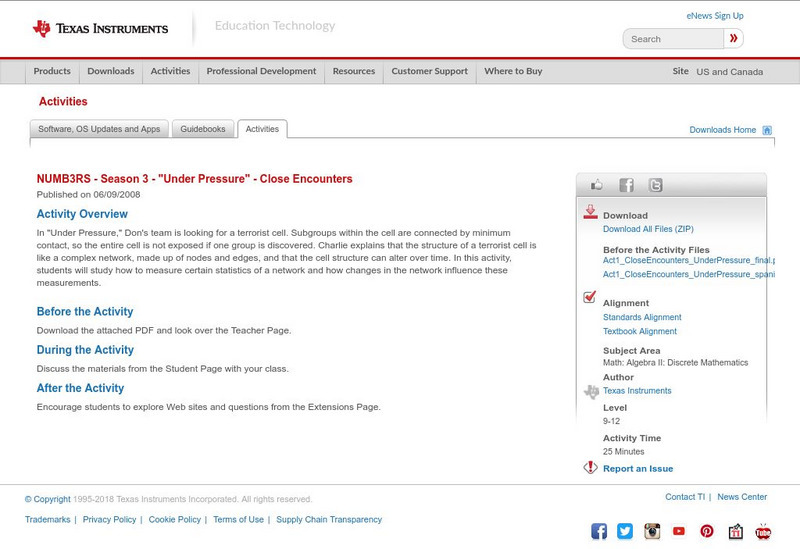 Based off of the hit television show NUMB3RS, this lesson has students explore how "closely connected" a network structure is. Framed in the context of a terrorist cell, students must find which setups would allow organizations to still...