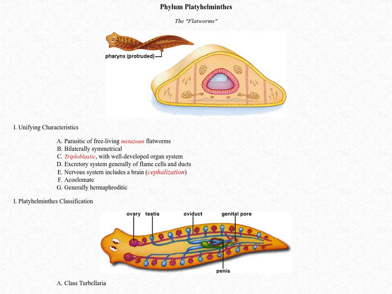 High school level description of the phylum Platyhelminthes, or flatworms, including characteristics, reproduction, and class.