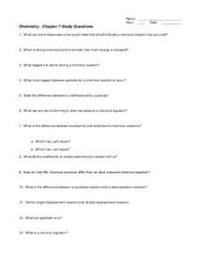 In this reactions worksheet, students state the differences between a coefficient and subscript and an exothermic and endothermic reaction. Students review the different types of reactions. This worksheet has 13 short answer questions.