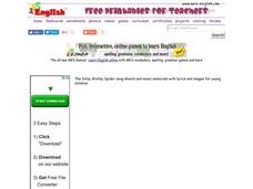 In this early childhood song lyrics and images worksheet, students practice reading and singing the words of "Itsy Bitsy Spider".
