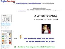 In this letter to Santa worksheet, students read the letter, answer multiple choice questions, put sentences in order, tick things mentioned in the letter, and more. Students complete 5 activities total.