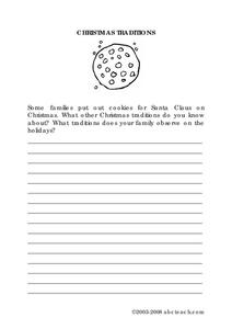 In this holiday worksheet, students write an essay about their family's Christmas traditions. Students color a picture of a plate of cookies for Santa.