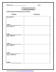 In this radius worksheet, students calculate the radius of a circle when the area is given to them. Students complete 5 problems total.