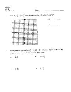 In this circles worksheet, 10th graders solve and complete 16 various types of problems. First, they state the center and radius for the given equation and graph. Then, students determine if each point is on the circle, in its interior,...