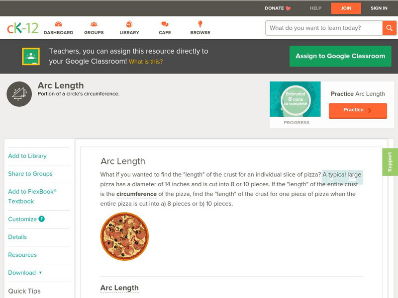 [Free Registration/Login may be required to access all resource tools.] This concept teaches students to find the length of an arc. Students examine guided notes, review guided practice, watch instructional videos and attempt practice...